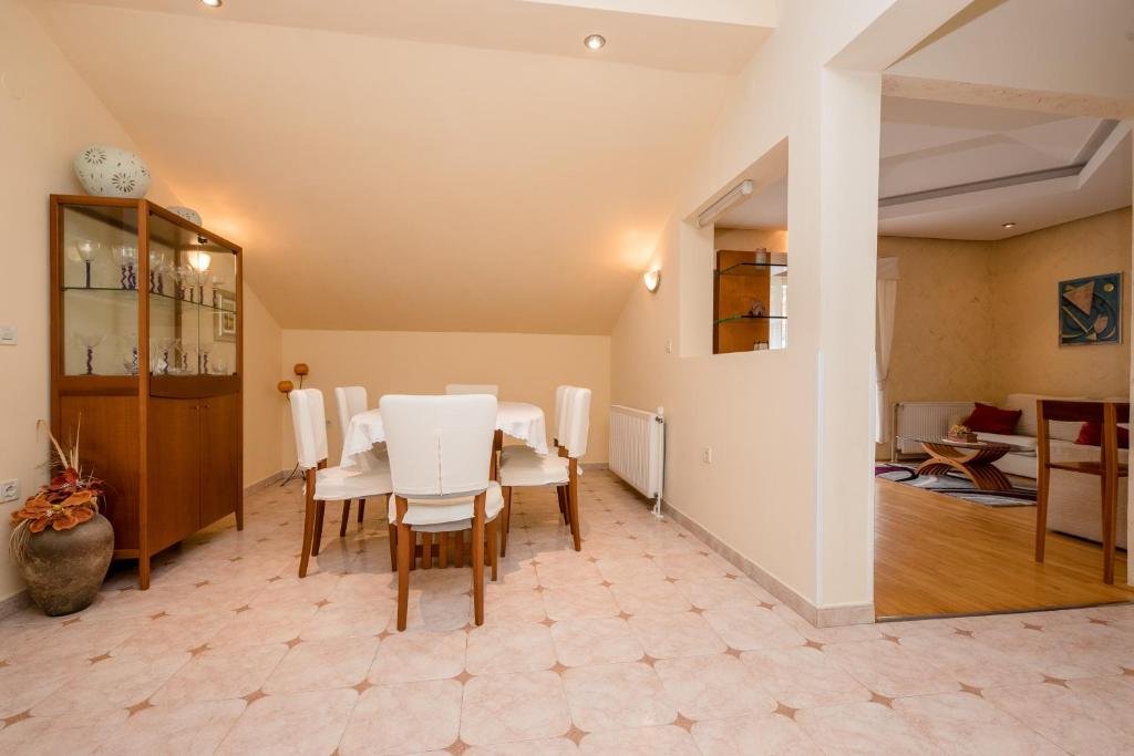 Apartman ima opremljenu kuhinju sa frižiderom, mikrotalasnom rernom, mašinom za pranje sudova, rernom, pločom za kuvanje, tosterom, posuđem i stolom za ručavanje, uz prijatnu trpezariju i prostor za sedenje.
